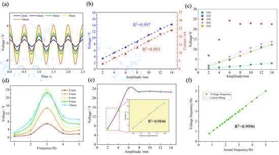 Influence of vibration parameters on the output performance of B-TENG. (a) B-TENG voltage output at different amplitudes of 2 Hz; (b) relationship between peak value of output voltage and current and amplitude; (c) relationship between amplitude and output voltage at different frequencies; (d) output voltage of B-TENG at different amplitudes of 1–5 Hz; (e) output voltage of B-TENG at different amplitudes of 3 Hz; (f) FFT results of the actual vibration frequency and voltage signals.