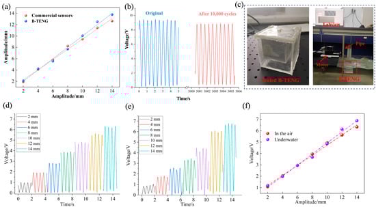Application verification analysis of B-TENG. (a) B-TENG measured amplitude results compared to commercial sensors; (b) durability test results; (c) sealed B-TENG and underwater test platform; output voltage of B-TENG at different amplitudes with a fixed frequency of 2 Hz; (d) in air; (e) underwater; (f) comparison between them.