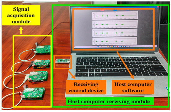 The sEMG has an amplitude range in the µV level and a frequency range between 20 and 500 Hz [35,36], which makes it susceptible to noise interference. Therefore, the processing circuit must fulfill the requirements of high input impedance, high gain, high CMRR, and low noise [37,38]. Most existing studies have used wired transmission to acquire sEMG [33,39,40], which can limit the user’s range of motion and inconvenience remote rehabilitation monitoring. In contrast, wireless acquisition allows users to move freely and realize remote dynamic monitoring. Most of the existing wireless sEMG systems (NORAXON and Delsys in the USA, MEGA in Finland, etc.) are not suitable for a wide range of applications due to their high cost, large size, and poor compatibility. To address the above problems, a multi-channel wireless sEMG acquisition system is designed in this study. The system block diagram is shown in Figure 2 and the physical system diagram is shown in Figure 3. The system contains a signal acquisition module and a host computer receiving module. The sEMG signal acquisition module consists of EMG electrodes, a hardware pre-processing module, a wireless transmission module, and a power management module. The system is controlled by the MCU integrated into the wireless transmission module. The host computer receiving module consists of the receiving central device and the host computer software.