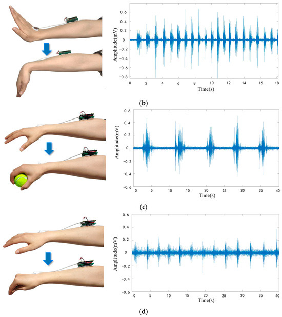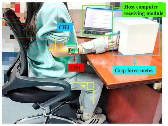 The following steps refer to the SENIAM guidelines [42]. After removing body hair, cleansing the skin with medical alcohol, and lightly scrubbing the skin, the surface electrodes were attached to the muscle belly of the muscle to be tested. The surface electrodes oriented as far as possible in the direction of the longitudinal axis of the muscle fibers. In general, due to possible differences in muscle activity patterns and electrode positions among individuals, it is necessary to place the reference electrode in a location that is far away from the target muscle, has the least risk of large common mode interference signals, and is relatively stable and minimally affected by movement. In accordance with the SENIAM guidelines and research [43], the dorsal side of the wrist was chosen as the reference electrode position for measuring sEMG signals from the forearm muscles. CH1 was attached to the ECRL and CH2 was attached to the FCR, as shown in Figure 6b. Verification of surface electromyography (sEMG) signal quality was achieved by observing the waveforms on the host computer after sensor placement.
