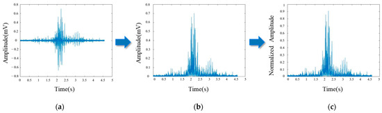 Then, data segmentation was performed to save each segment of valid sEMG signals. Subsequently, each segment of the EMG signal was band-pass filtered using a zero-phase fourth-order Barwaters filter with a frequency range of 20–490 Hz, which is the fundamental frequency range in which the sEMG signal is located. Due to the alternating nature of the EMG signals, full-wave rectification was required after the filtering was completed to flip the negative values above the baseline. Finally, the maximum value of MVC of each volunteer was made as the standard, respectively, and each data point was normalized according to Equation (1). The process is shown in Figure 9.