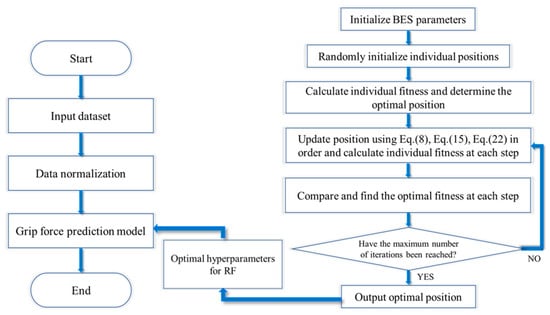 There are commonly two methods used for analyzing the relationship between sEMG signals and grip force: model-based methods and machine learning methods. The former obtains the final grip force by establishing the relationship between the sEMG signal, muscle model, and muscle output force; the latter uses the sEMG signal as the input and the force signal as the output to establish the fitting relationship. In this study, we choose to use the Random Forest algorithm in machine learning and try to use the bald eagle search optimization (BES) algorithm for parameter optimization of RF to predict the grip force.