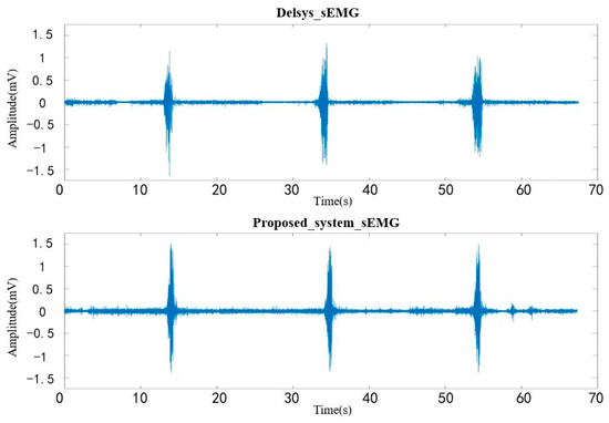 Table 6 demonstrates the comparison between this work and other research work. In the wireless transmission system, the proposed four-channel discrete acquisition terminal is more flexible and can better monitor the interactions and influences between muscles at different locations than the integrated acquisition terminal [30,57]. The proposed system is a system not limited by the wiring between the acquisition electrodes and the processing circuitry. Connecting the electrodes by snap fasteners to reduce wire length and suppressing interference by symmetrical differential signals makes the system more adaptable to the environment with high common mode rejection ratios across the main frequency range of sEMG.