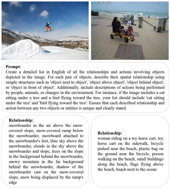 The following two images are presented to illustrate the generation of object-relational data. As shown in the Figure 2, the first image depicts the dynamic activity of a snowboarder on a snow field. The descriptions generated by the Qwen-VL model encompass not only the spatial relationship between the snowboarder and objects such as the snow field and the ski jump, as exemplified by “snowboarder in the air above the snow-covered slope” and “snow-covered ramp below the snowboarder”, but also describe the skier’s movements, such as “snowboard attached to the snowboarder’s feet”, as well as the environment and environmental changes, including “trees on the slope”, “snowy mountain in the far background”, and “snow being displaced by the ramp’s feet”. In addition to describing the spatial relationships between the snowboarder and the surrounding objects, such as the snow-covered ramp below the snowboarder and the trees on the slope, the model also provides insights into the skier’s movements, including the attachment of the snowboard to the skier’s feet. Furthermore, it captures the environmental context, including the presence of a snowy mountain in the background and the displacement of snow by the ramp’s feet. The descriptions encompass not only the relative positions between objects but also the interaction between the activity and the environment, thus helping to complete the depth and spatial layout of the image scene. The second image depicts a scene of a woman in a toy wagon. In this scene, the model details the action “woman riding on a toy horse cart” and indicates the location of the toy horse cart “toy horse cart on the sidewalk”. Furthermore, the model also captures other actions and object relationships, such as “bicycle parked near the beach” and “person walking on the beach”, which contribute to the dynamic elements and background information of the scene.