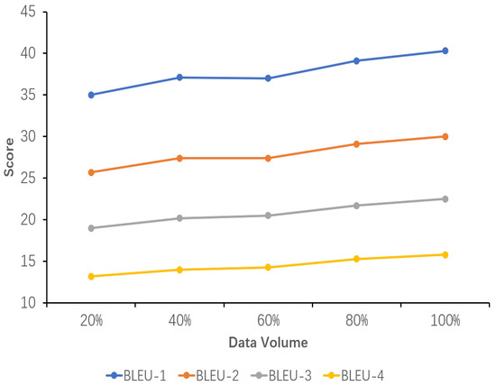 Sensitivity analysis of the performance of the fine-tuned model using datasets with different data volumes. Percentages represent the percentage of the ICICD dataset accounted for. The variation of the BLEU-n(1-4) scores with increasing data volume is shown here.