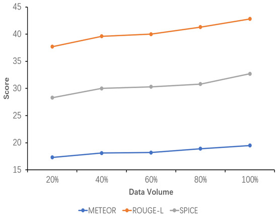 Sensitivity analysis of the performance of the fine-tuned model using datasets with different data volumes. The variation in the METEOR, ROUGE-L, and SPICE scores with increasing data volume is shown here.