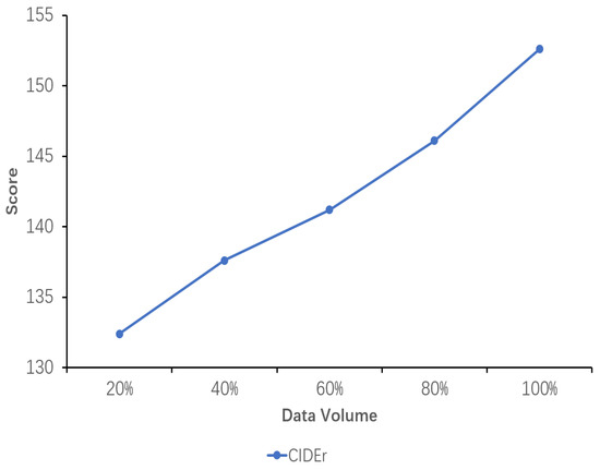 Sensitivity analysis of the performance of the fine-tuned model using datasets with different data volumes. The variation in the CIDEr scores with increasing data volume is shown here.