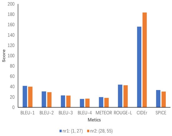 A sensitivity analysis is conducted on the data generated by the model ECRMM on the test set to ascertain the impact of the number of object-relative sentences on the performance of the evaluation metrics. First, the number of object-relative sentences is counted and divided into two ranges of phrase count values, designated as nr1 and nr2, based on the minimum and maximum values. These values are then evaluated separately for each range. According to the statistical analysis, the minimum and maximum values for the number of object-relative sentences are 1 and 55, respectively. In Figure 8, the results demonstrate that nr1 exhibits high performance, with all metrics outperforming the performance of the model ECRMM. This indicates that a moderate number of object-relative sentences can effectively support the generation of high-quality image descriptions. While Nr2 still performs well on CIDEr (183.6), it is evident that the descriptions are less unique and relevant than those generated by Nr1. This is evidenced by the decrease in Bleu and METEOR scores, with SPICE decreasing to 30.6. This suggests that the semantic accuracy of the descriptions has decreased.