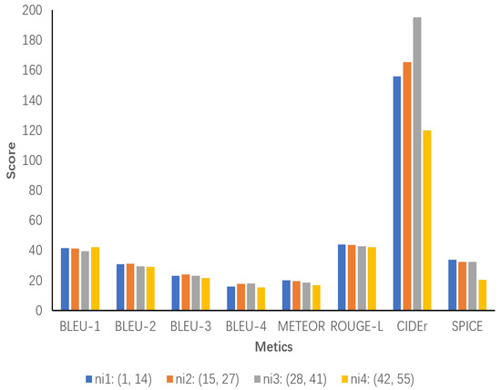 We then divide nr1 into two intervals, ni1 and ni2, and nr2 into ni3 and ni4 and then again score each of the four intervals. As shown in Figure 9, the results indicate that ni1 performs better in most of the metrics, and ni2 shows a significant increase in Bleu-4 and CIDEr compared to interval 1. This suggests that increasing the number of object relationship clauses within the interval helps the model to generate more accurate and information-rich descriptions. However, ni3 shows a slight decrease in Bleu-1, METEOR, and SPICE, although the CIDEr metric is high at 195.3, indicating that the descriptions become complex or overly detailed due to the excessive number of object relationship sentences. Ni4 exhibits a significant decrease in performance, indicating that excessive object relationship sentences cause the descriptions to be redundant or incorrectly generated. Redundancy or generation errors in the description affect the coherence and accuracy of the description.