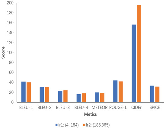 Additionally, a sensitivity analysis of inference chain length is conducted. The number of words in all inference chains generated by the model ECRMM on the test set is initially counted and then divided into two ranges based on the minimum and maximum values, range1 and range2. Each range is evaluated separately, with the results presented separately. According to our statistical analysis, the minimum and maximum values of inference chain lengths are 4 and 365, respectively. In Figure 10, lr1 demonstrates slight superiority over lr2 in most metrics, particularly Bleu-1, ROUGE-L, and SPICE, which indicates that shorter inference chains are sufficient for high-quality descriptions within this range. It can be concluded that chains of a sufficient length are sufficient to provide high-quality descriptions in this range. Despite its excellent performance on CIDEr, lr2 underperforms compared to lr1 on most metrics. This is due to the fact that excessively long inference chains increase the complexity of the descriptions without necessarily improving their quality.