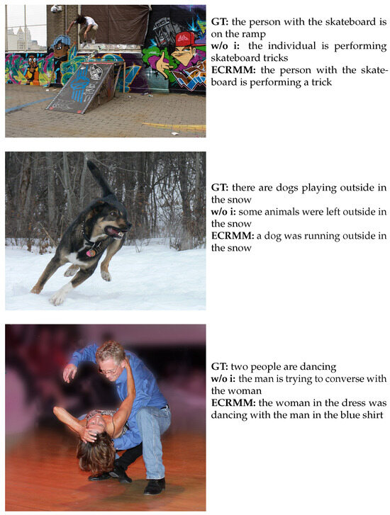 The model’s performance in terms of qualitative results is noteworthy. As shown in Figure 12, the descriptions generated by ECRMM are more consistent with GT’s utterance structure, as evidenced by the descriptions generated by ECRMM in the first and second images. ECRMM employs inference chaining to enhance the accuracy of the descriptions generated, as exemplified by the increased precision of “a dog” in the second image compared to “some animals” and the enhanced accuracy of “dancing” in the third image compared to “trying to converse”. In the second image, the description “a dog” is more accurate than “some animals”. Similarly, in the third image, “dancing” is more accurate than “trying to converse”. For instance, “a dog” in the second image is more accurate than “some animals”, and “dancing” in the third image is more accurate than “trying to converse”. The ECRMM model is capable of generating more descriptive and detailed text through the use of inference chains. In the second image, the “was running outside” generated by ECRMM is more focused on the primary action depicted in the image than the “were left outside” generated by w/o i. The “in the dress” and “in the blue shirt” generated in the third image capture additional details in the image and provide a highly specific description.