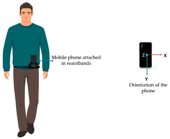 As pointed out in the study by [18,22], which investigated several accelerometer placements, including at the hip (belt), wrist, upper arm, ankle, and thigh of the test person, using numerous accelerometers aids in activity identification. Thus, as illustrated in Figure 2, in this study, participants were advised to secure their mobile phones to their waistbands with designated holders. This strategy guaranteed that the phones remained in a consistent and steady position throughout the data collection process. The test persons were advised to keep the mobile phone in a vertical orientation within the holder to preserve consistency. This placement of the phones enabled the accurate gathering of data on walking speed, acceleration, and GPS position during the experiments.