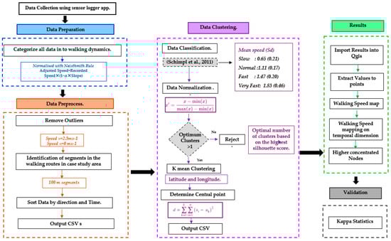 Clustering individuals based on their walking speed, direction, and time enables the precise classification of walking behavior. K-means clustering aids in identifying clusters [9]. Mapping identifies locations with high levels of pedestrian traffic and their distribution. Clustering identifies areas with high levels of foot traffic or congestion hotspots, allowing for more analysis to guide more effective solutions. Data analysis included three steps.