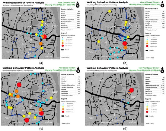 Pedestrian concentration in slow walking speeds (a), normal walking speeds (b), fast walking speeds (c), and very fast walking speeds (d) in the morning hours.