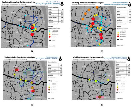 Pedestrian concentration in slow walking speeds (a), normal walking speeds (b), fast walking speeds (c), and very fast walking speeds (d) in the evening hours.