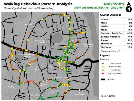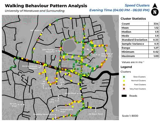 Inside the University of Moratuwa, during the morning hours, there is a high degree of pedestrian concentration observed in the Lagan area. This congestion can be categorized as slow and normal speed clusters. Based on on-site observation, this location in the university is predominantly a green environment, which is similar to findings of [28] research that indicates that individuals tend to walk slower in greener environments. In addition, the concentration of speed in different areas of the University of Moratuwa is constant.