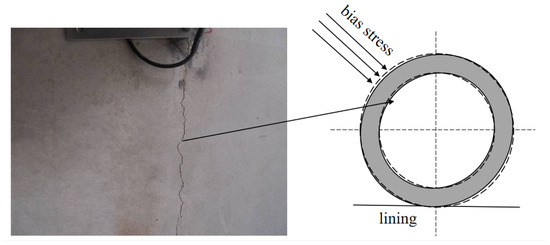 The Deqin Tunnel is located in the high-altitude area of western Yunnan, China. The altitude of the tunnel site area is 3416.68–3662.00 m. The overall length of the tunnel is 1530 m; the maximum depth of the tunnel is approximately 242.47 m. The tunnel body is on a slope along the vertical direction of the tunnel, with a slope of 15 to 35°. The slope section is asymmetrical along the axis of the cave body, and there is a bias phenomenon. During the tunnel excavation process, the eccentric pressure of the surrounding rock causes the tensile stress of the lining structure to exceed the bearing range of the lining structure, and the side walls of the structure shrink and deform. When the maximum stress on the side walls exceeds the maximum load-bearing range of the concrete, the lining structure has structural instability and cracking [24]. The cracking of the lining structure is shown in Figure 1.