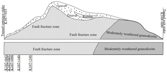 Based on findings from engineering geological surveys and geophysical explorations, it is determined that the entire tunnel site area is covered by a sparse layer of Quaternary Holocene slope gravel. Predominantly comprising slate and shale, the entrance and tunnel body of the site give way to granodiorite at the exit section. The slate and shale rock layers exhibit an angle of inclination measuring 60 degrees. Based on measurements and statistical analysis of bedrock outcrops at the site, it is evident that the rock mass within the tunnel site area exhibits structural joints and relatively extensive fissures. The tunnel traverses primarily through the fault fracture zone comprised of slate and shale, transitioning to the granodiorite layer at the exit section. Figure 2 displays the longitudinal section of the tunnel.