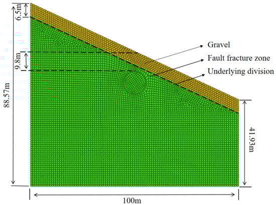 Assume stress and strain variations across all materials remain within the elastic-plastic threshold, independent of spatial influences and moisture content. The tunnel structure is influenced solely by the gravitational forces exerted by the surrounding rock mass. Considering the actual depth and dimensions of the tunnel, the model’s width is established at 100 m. At a burial depth of 9.8 m, the left side heights of the three biased models are 71.84 m, 88.57 m, and 100.26 m, the heights on the right side are 51.85 m, 41.93 m, and 30.24 m, respectively, corresponding to bias angles of 15°, 25°, and 35°. There are two strata in the mountain from top to bottom: the gravel layer and the fault fracture zone composed of slate and shale. The gravel layer has a fixed height of 6.5 m. Throughout the tunnel excavation process, the upper boundary corresponds to the free surface, with horizontal displacement constraints applied to the boundaries flanking the mountain, whereas the bottom boundary remains fixed. The initial stress field only considers the gravity stress field and ignores the tectonic stress field. Through the establishment of corresponding construction stages, the simulation of the tunnel construction process is finalized. The primary objective is to streamline the dynamic excavation process into a methodical static construction sequence, achieved through two distinct approaches: “activation” and “freezing”. Throughout the excavation process, the soil slated for removal undergoes freezing, whereas support and lining units are activated, culminating in the completion of the tunnel excavation simulation. Figure 3 illustrates the cross-sectional model of the tunnel with a 25° bias.