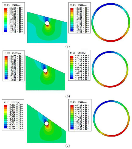 Figure 4 illustrates the displacement and deformation of the tunnel under biased pressure. Deformation is mainly concentrated at the vault and invert locations. In Figure 4a, with a 15° bias angle, the vault experiences a maximum settlement of 0.14 mm, and the invert arch reaches a maximum uplift of 0.34 mm. In Figure 4b, with a 25° bias angle, the vault settles by up to 0.19 mm, and the invert arch lifts by up to 0.37 mm. Figure 4c shows vertical deformation under a 35° bias angle, with the invert arch lifting by up to 0.42 mm and the vault settling by up to 0.27 mm. This analysis shows that as the bias angle increases, the displacement and deformation of vault settlement and invert uplift also increase. The focal point of displacement and deformation shifts from the vault to the spandrel as the bias angle increases. Therefore, the concentration point of displacement and deformation moves towards the bias direction as the bias angle increases.