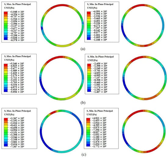 Stress distribution of tunnel lining under three bias angles. (a) 15° bias, (b) 25° bias, (c) 35° bias.