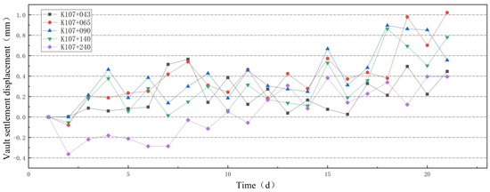 The settlement of the tunnel lining structure is influenced by the surrounding rock, causing variations in vault displacement. During monitoring, a positive vault displacement value indicates downward movement, whereas a negative value indicates upward extrusion deformation. Figure 6 shows the vault settlement displacement.