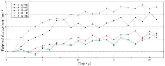 Tunnel settlement and peripheral convergence are critical indicators for evaluating the safety and stability of tunnel structures. Initial on-site observations reveal axial compression cracking along the inner wall of the tunnel lining. The displacement of the tunnel support structure reflects the mechanical behavior of the structure. Therefore, stability can be assessed through displacement analysis. To monitor structural deformations, five sections from K107+043 to K107+240 were selected for peripheral convergence and vault settlement monitoring. The vault and peripheral displacements of these sections were tracked over a 21-day period (once daily) to assess their conditions and analyze the monitoring outcomes.