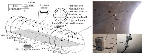 Following an analysis of structural deformation, five monitoring sections, spanning from K107+043 to K107+240, were identified for the deployment of FBG sensors. Given that the inward displacement and outward expansion of the lining structure, prompted by the surrounding rocks, induce circumferential strains along the section, a total of seven FBG strain sensors were installed in circumferential positions along the section to measure the strain within the lining structure. Additionally, two FBG strain sensors for measuring lining temperature were strategically placed—one on the vault top and the other on the left arch foot.