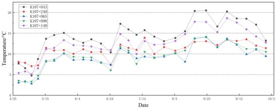 Through monitoring the tunnel sections, temperature readings from the vaults and the left arch foot of five specific sections were acquired. Considering the negligible temperature discrepancy between two monitoring points on the same road section, the average value of these points is adopted as the representative temperature for each road section. The temperature fluctuations across the five-month period for each section are illustrated in Figure 10. Throughout this time frame, from April to September, there was a gradual increase in temperature across all sections, culminating in a peak before gradually receding. Figure 10 reveals that, commencing from section K107+043 positioned at the tunnel opening, the temperature of the secondary lining gradually diminishes with increasing tunnel depth. This phenomenon can likely be attributed to the heightened influence of the external ambient temperature as the opening nears the outer environment. Notably, the temperature observed at section K107+240 exceeds that of sections K107+065 to K107+140. This discrepancy may stem from the presence of geothermal energy within the cavern. The findings suggest that the temperature near the tunnel entrance is more susceptible to short-term fluctuations in external ambient temperature compared to deeper tunnel regions. Section K107+240 exhibits pronounced temperature fluctuations owing to the combined effects of ambient temperature and geothermal energy.