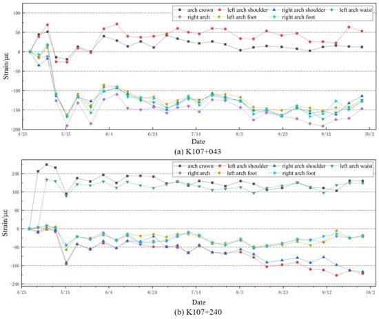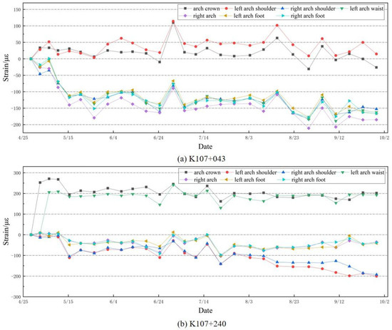 The total strain in each section was monitored from April to September (twice a week). The detection results of two typical sections, K107+043 and K107+240, are analyzed, as shown in Figure 11. According to Figure 11a, the monitoring section at K107+043 indicates that the maximum compressive stress in the lining structure shifts from the arch crown to the left arch shoulder, with the left arch shoulder experiencing the greatest compressive stress, followed by the arch crown. The maximum compressive stress shifts from the right arch foot to the right arch waist, with the right arch waist experiencing the greatest tensile stress, followed by the right arch foot. Therefore, this section exhibits an approximately 35° bias angle. This also verifies the reliability of the simulation model and the effectiveness of the selected sensor locations.