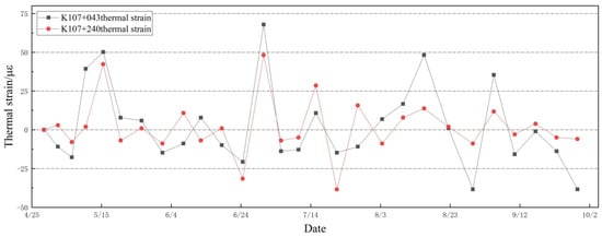 The monitoring system employs Equation (5) to demodulate thermal strain and applied stress–strain, as illustrated in Figure 12 and Figure 13, respectively. Throughout the temperature change process, the thermal apparent strain of the secondary lining undergoes significant variations. Both sections K107+043 and K107+240 exhibit an initial thermal strain of 0 µ, with the maximum thermal strains reaching 67.97 µ and 48.27 µ, respectively, occurring on the same day.