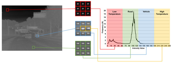 When viewed as a histogram plot, pixel values can be grouped into a total of four regions. First, in the case of the sky with a lower temperature compared to surrounding objects (without the sun), it falls within the first group (region) with pixel values between 0 and 63. Second, on vehicle-driving roads such as asphalt, it falls within the second group (region) between 64 and 127. Third, the vehicle falls within the pixel group (region) between 128 and 191. Lastly, parts expressing high temperatures, such as exhaust pipe or the sun, belong to the fourth group (region) with a pixel value of 192 or higher. In other words, in terms of histogram frequencies, unlike CMOS-based cameras, it was observed that the pixel values from the 8-bit infrared thermal image exhibit the characteristic of being clustered in specific groups (regions).