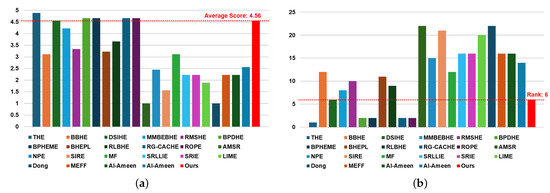 Table 2. Our method achieved an average score of 3.44 and ranked 5th when sorted from top to bottom. This places our method within the top 30% (approximately within the 7th rank) overall for this scenario. In the histogram-based contrast enhancement method category, our method secured the 1st rank when ranked sequentially, indicating it received the highest average score among its peers. Comparing our proposed method with retinex- or other technique-based contrast enhancement methods, it ranked 5th, placing it within the top 50% (approximately 6 out of 12).