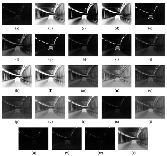 Figure 5b,d,k,l, the contrast has been improved to the point where the driving environment within the tunnel can be accurately distinguished compared to the results of the other histogram-based contrast enhancement methods. However, the vehicle region is so oversaturated that the wheels and vehicle body cannot be visually distinguished, and the auxiliary lights in the tunnel also appear oversaturated.