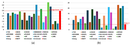 Figure 4, our method obtained an average score of 4.56 and ranked 6th when sorted from top to bottom. Being ranked 6th implies being within the top 30% (approximately within the 7th rank) overall. When analyzing solely within the histogram-based contrast enhancement method category and ranking sequentially, the proposed method is positioned in the 6th rank, indicating it received a medium average score. Compared to contrast enhancement methods based on retinex and other techniques, it is apparent that the proposed method achieves a better rank than conventional methods. In other words, through subjective evaluation, which visually assesses the image, it is confirmed that histogram-based contrast enhancement methods are most effective in the best driving scenario.