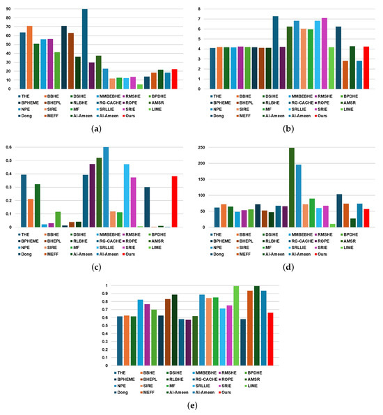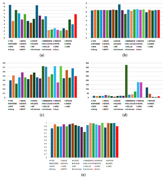 Figure 3. When utilizing the proposed method, the EME, entropy, LIF, LOE, and SS metrics are 6.8451, 6.4485, 0.4959, 15.8458, and 0.9043, respectively. For metrics where higher values indicate better performance, the method showing the highest performance in EME is THE with a value of 9.5430, and the proposed method ranked 6th with a value of 6.8451, which means that when considered as a percentage, the proposed method is in the top 30% (approximately within the 7th top rank). When considering