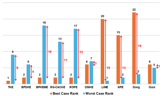 Figure 10 illustrates the performance disparity between methods that excelled in subjective evaluation in the best and worst driving scenarios. Notably, methods like THE, BPDHE, BPHEME, RG-CACHE, and ROPE, which performed well in the best scenario, exhibit significant rank differences ranging from 4 to 16 or more in the worst scenario. Conversely, LIME, NPE, and the method proposed by Dong, which showed effectiveness in the worst scenario, display rank differences of at least 13 to 19. Interestingly, DSIHE and our proposed method demonstrate minimal variation in ranking between the best and worst scenarios. However, our method consistently ranks higher (6th and 5th) compared to DSIHE (6th and 7th), indicating superior performance and uniform image information provision on average. Therefore, for LWIR-based thermal-imaging cameras used in defense and electronics industries, our proposed method emerges as a viable choice due to its ability to consistently deliver uniform information to users.