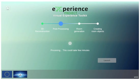 VET was developed using Unity3D (Version 2020.3.39f1). The application presents a custom GUI (Figure 2) to guide the user during the whole pipeline and to show the current state of the processing, showcasing the different steps of the pipeline and its progression.