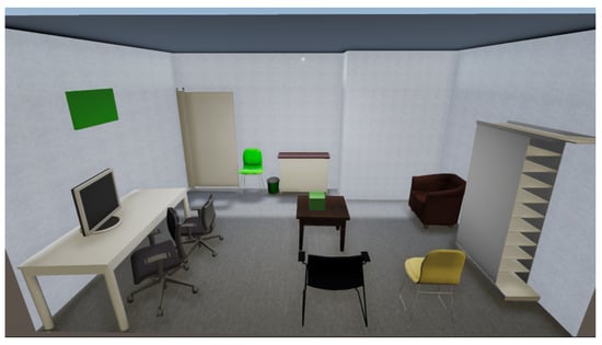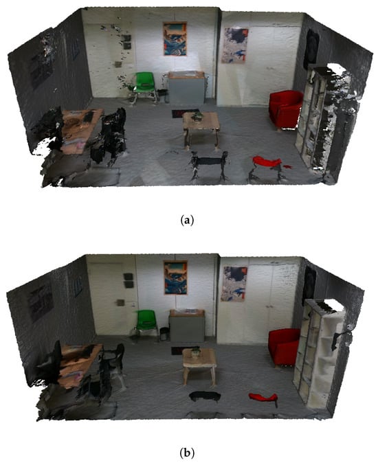 On a more general note, the framework is limited by the initial input of the data acquisition step. Therefore, it is recommended that the user uses a good quality RGB-D camera, and it is important that the user scans the room carefully and in detail in order to ensure that the room has been correctly captured. Moreover, VET is tailored to specific indoor scenarios, specifically homes and offices, and will generate lower-quality virtualizations in industrial or sanitary environments. This is primarily due to the use of ScanNet for the training of Mask3D, which is focused on homes and offices, and the use of ShapeNet in the CAD alignment and retrieval step, which lacks CAD models for industrial or sanitary objects. Additionally, it is not targeted to dynamic scenarios, where objects, persons, or animals are in motion; this is due to the tracking method using the RGB and depth information to track the camera, and moving objects appear in different positions in each frame, possibly generating an incorrect camera pose prediction or simply losing completely the pose tracking. Finally, regarding scalability, with the hardware described in Section 4 and a voxel size of 1 cm, we were able to capture approximately 15,000 images in around 20 min, covering a surface area of roughly 75 m2; we recommend this value as a maximum surface area to ensure quality scanning of the room.
