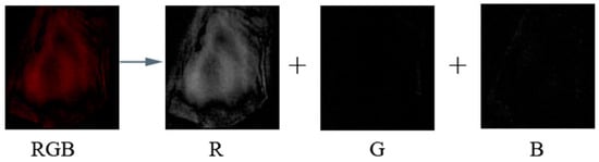 Step 2: The differential image (Figure 2) has 3 color channels, red, green, and blue (RGB), as shown in the figure below. Since B12 is red, the red image channel was used for further analysis. It was converted to a grayscale image representing 1 as black and 255 as white, encoding the red color’s intensity information. A custom program was created to extract the red-colored plane information from the RGB image and calculate the mean value of the image histogram; then, it was plotted as color difference intensity vs. time.