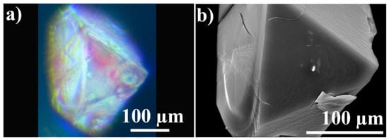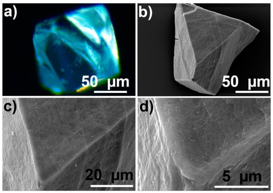 Figure 3a shows an example of a MOF crystal before infusion. This optical microscopy image demonstrates typical a Tb-mesoMOF crystal with linear dimensions ~100 µm. Different crystal faces are well defined, and the color information can be easily extracted. The original crystal is clear before any infusion, and thus vitamin B12-related color change is very pronounced. The scanning electron microscope (SEM) image of a similar crystal, Figure 3b, shows more structural details because of the larger depth of field and higher resolution. Figure 3c,d show the same crystal with higher magnification. It can be noticed that the crystal has very well-defined crystal planes with many more details than that in an optical microscopy image. Additionally, even though it looks smooth under the optical microscope, the higher magnification SEM image (Figure 3d) shows that it has nanoscale surface roughness. Below is a comparison of two types of information—color from optical microscopy and structure from SEM are used to study mechanisms of molecular infusion in single Tb-mesoMOF crystals and identify the factors that influence this process.