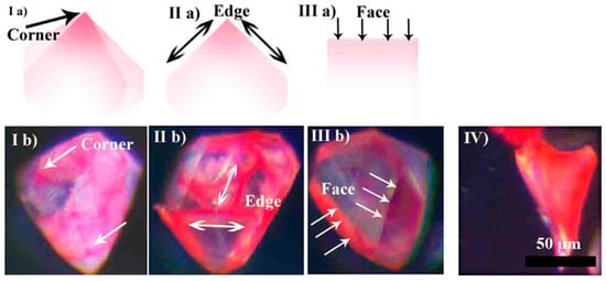 Sections II–IV have two subsections each—a and b. There, (a) demonstrates samples that were not cut, and (b) demonstrates ones that were split in half. The splitting was performed with a diamond scriber while observing them under the microscope. Figure 6(IIa,IIb) show Tb-mesoMOF crystals after 20 min of vitamin B12 uptake. The crystal shown in Figure 6(IIa) has some of the faces completely colored in red, while others are mostly colored along the edges. The second sample shown in Figure 6(IIb) is cut in half, and its interior is still intact and colored white, implying that no or little diffusion reached the middle part of the crystal. Additionally, most of the diffusion into the crystal interior happened through the brightly colored faces. The same effect was observed with a longer diffusion time.