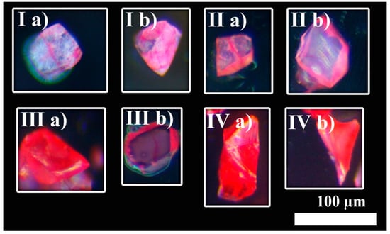 After that, continuous dynamics of vitamin B12 uptake were studied using multiple Tb-mesoMOF crystals placed in vitamin B12 solution. Crystals were taken out of the solution at regular intervals and observed under an optical microscope (Figure 6). Some of them were studied directly to obtain information about surface distribution of the guest molecules. Others were cut in half to study volume distribution. Figure 6 demonstrates that the intensity of the red coloration of individual crystals increases with time and progresses from pale pink in Figure 6(Ia) to a bright red color in Figure 6IV. However, this color change did not happen uniformly across the whole batch of the single crystals. For example, both crystals shown in Figure 6(Ia,Ib) were infused for 10 min. However, the crystal shown in Ib has higher surface roughness, a larger number of edges, and more surface defects and thus has a brighter pink color than the crystal shown in Ia.