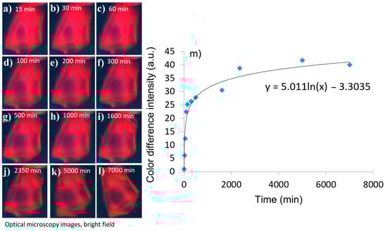 It can be noticed that the red-colored area continuously decreases with time indicating diffusion of vitamin B12 out of the crystal. All the changes were monitored relative to the initial state of the crystal shown in Figure 7a. The maps of color change were obtained by subtracting the initial image (a) from subsequent images (b through l). Next, histograms were applied to the color analysis of the subtracted images. Here, we adapt this technology to study diffusion dynamics in MOF crystals by using continuous tracking of histogram change of the images of the crystal. Consecutive images taken at different time intervals were digitally subtracted from the reference image, and the resulting difference was used for further estimation of diffusion dynamics. Specifically, RGB (red, green, and blue) components of the subtracted images were separated, and only the red component was used for further analysis. The red component of the image was converted to a grayscale image with 0 being black and 255 as white. Mean intensity values of the images were calculated and plotted (Figure 7m), and the approximation for logarithmic diffusion was used [39]. This change in mean intensity value was correlated to the dynamics of the vitamin B12 diffusion out of the MOF crystal. It can be observed that the initial release was high during first 3000 min, but it then reached a plateau and almost stopped, even though the crystal still had areas infused with the vitamin and colored in red. The estimated diffusion rate was calculated based on the mathematical apparatus described in the previous section; it was found to be ~1.49 × 10−15 m2/s. The order of magnitude of the diffusion coefficient corresponds well with previous findings [19,40,41,42,43,44,45].