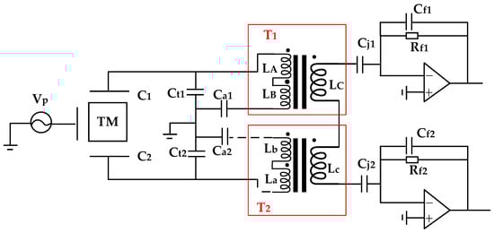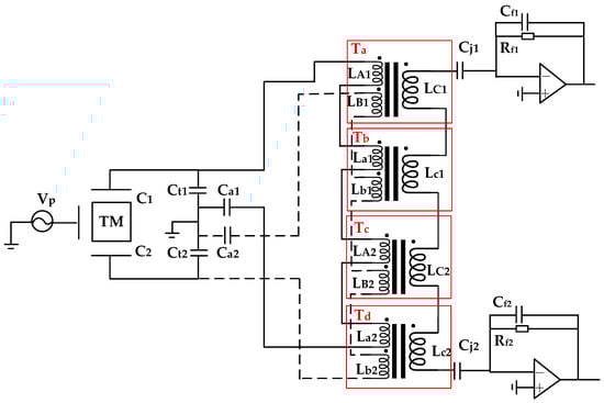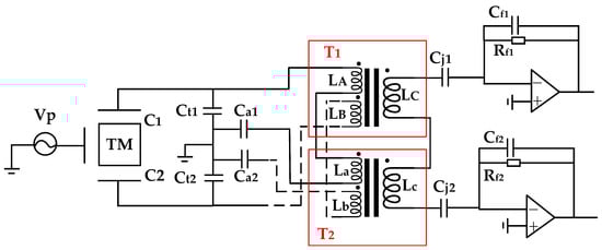 In the scheme described, and represent the tuning capacitors, and and are allocated as drive-function reserved capacitors, which can also be utilized to adjust the symmetry [24]. The transformer pair is composed of transformer 1 () and transformer 2 (). , , and denote the primary and secondary windings of transformer 1, while , , and signify the primary and secondary windings of transformer 2. and serve as the decoupling capacitors between the transformers and the transimpedance amplifier (TIA). and are the feedback resistors, while and are the feedback capacitors. For the sake of analyzing system performance, Figure 2 is simplified to the circuit representation in Figure 3.