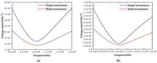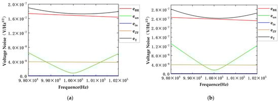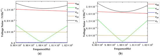 The simulation results indicate that the proposed scheme achieves the minimum circuit noise at the resonant frequency. At this frequency, the other three types of noise are significantly lower than the , making them the primary contributors to circuit noise. In the proposed scheme, the is reduced from 2.385 × 10−7 to 1.687 × 10−7, approximately 0.707 times the original value, and the is decreased from 1.657 × 10−8 to 8.506 × 10−9, approximately 0.51 times the original value, at the resonant frequency. The real part of the TIA feedback impedance thermal noise and the equivalent voltage noise produced by the TIA current noise remain almost unchanged. Utilizing yields conclusions consistent with those from . The results indicate that the proposed scheme primarily reduces and .