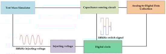 Inertial sensors are critical components in the detection of gravitational waves, and due to their high-precision demands, the majority of research efforts currently utilize capacitive displacement sensors. The simplified system architecture is illustrated in Figure 1, which primarily comprises a test mass (simulator), a resonant capacitive bridge, a set of transimpedance amplifier modules, a set of AC amplification modules, a bandpass filtering module, a demodulation module, a data acquisition module, an injection voltage module, and digital circuitry.
