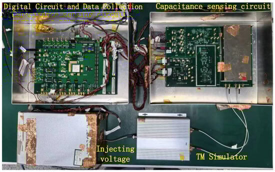 During the testing process, to validate the effectiveness of the bridge scheme, planar transformers (P-T1/P-T2) and conventional transformers (C-T1/C-T2) with different parameters were utilized for separate tests. Comparative experiments were also conducted with the original scheme. The system composition is illustrated in Figure 9, which includes a test mass simulator, an FPGA, an injecting voltage module, a capacitive sensing system, and a data acquisition module.