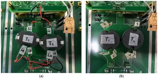 The actual connection diagrams of the planar transformers and the traditional transformers on the circuit board. (a) The planar transformers; (b) the traditional transformers.