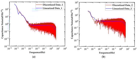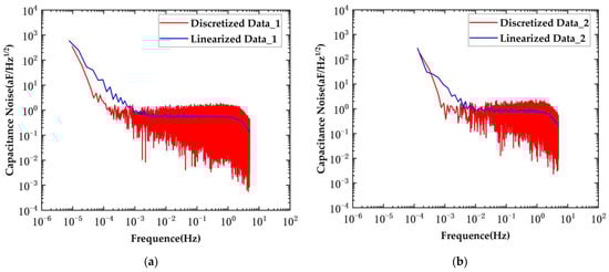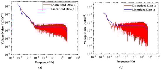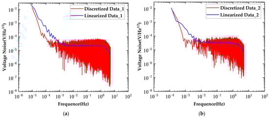 The results of the voltage noise test are presented in Figure 14. The red curve in the figure represents the discrete test results, while the blue curve corresponds to the linearized test results.